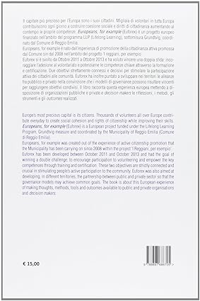 Europe’s most precious capital is its citizens. Thousands of volunteers all over Europe contribute everyday to create social cohesion and rights of citizenship while improving their skills.Europeans, for example (Euforex) is a European project funded under the Lifelong Learning Program, Grundtvig measure and coordinated by the Municipality of Reggio Emilia (Comune di Reggio Emilia).Europeans, for example was created out of the experience of active citizenship promotion that the Municipality has been carrying on since 2008 within the project ‘I Reggiani, per esempio’.Euforex has been developed between October 2011 and October 2013 and had the goal of winning a double challenge: to encourage participation to volunteering and empower the key competences through training and certification. These two objectives are strictly connected and crucial in stimulating people’s active participation to the community. Euforex was also aimed at developing, in different territories, the partnership between public and private sector so that the governance models may achieve common goals. The book is about this European experience of making thoughts, methods, tools and outcomes available to public and private organisations and decision makers.